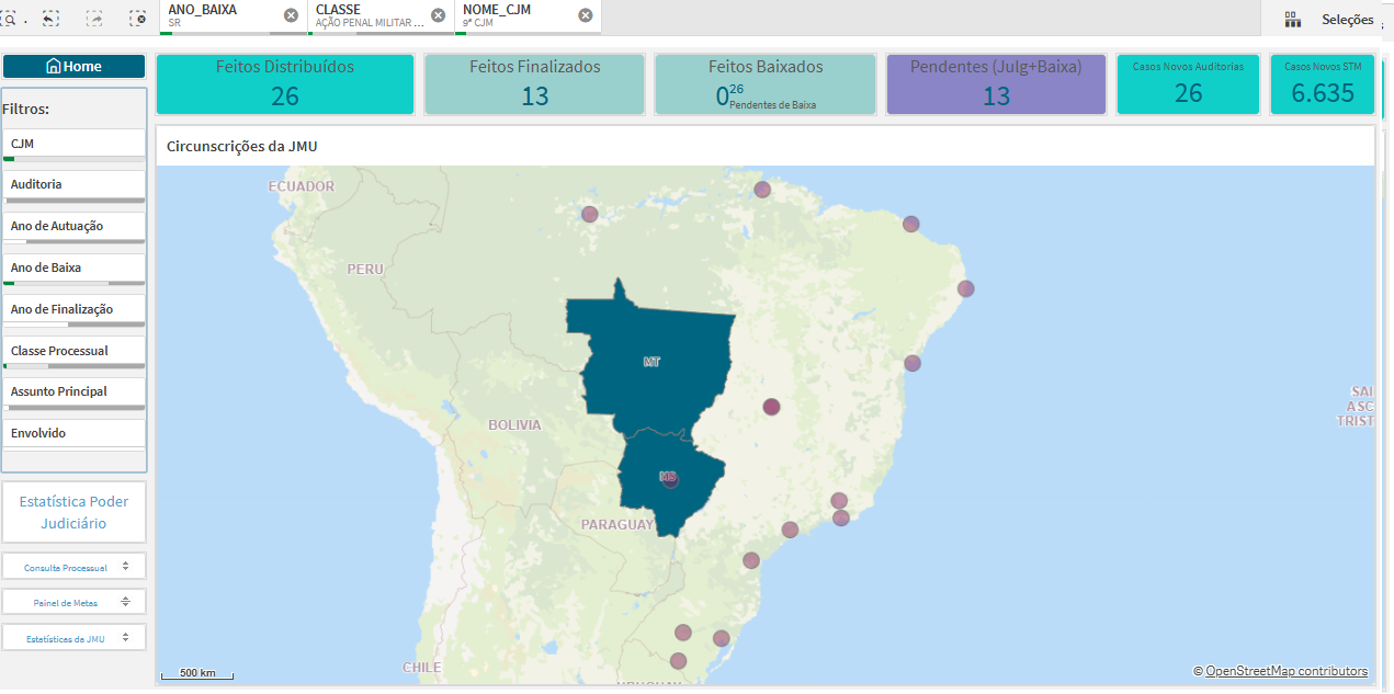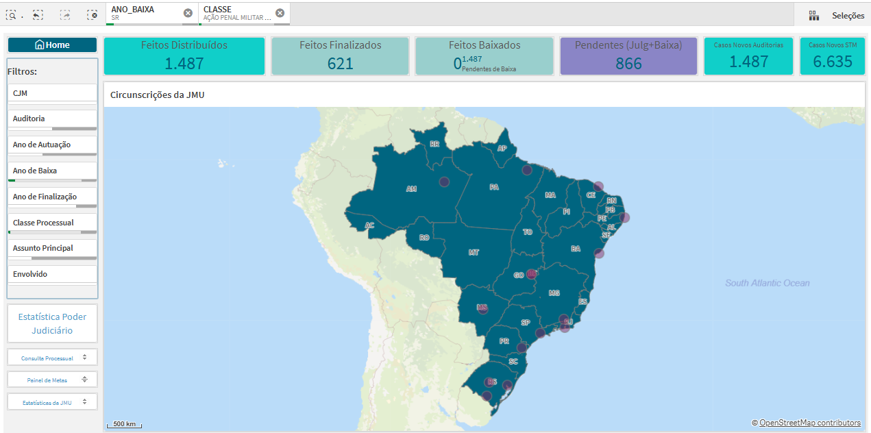 Por exemplo, a tela inicial do painel contém uma aba chamada “Mapas”, em que é possível conferir georreferencialmente os dados da 1ª instância da Justiça Militar da União. Ao filtrar, por exemplo, “Ano de Baixa” = “SR” (sem registro) e classe = “Ação Penal Militar”, é possível ver as quantidades de processos da classe Ação Penal Milirar pendentes de baixa. Há 1487 ações penais pendentes de baixa. Dessas, 621 já foram julgadas, mas ainda aguardam a baixa processual.